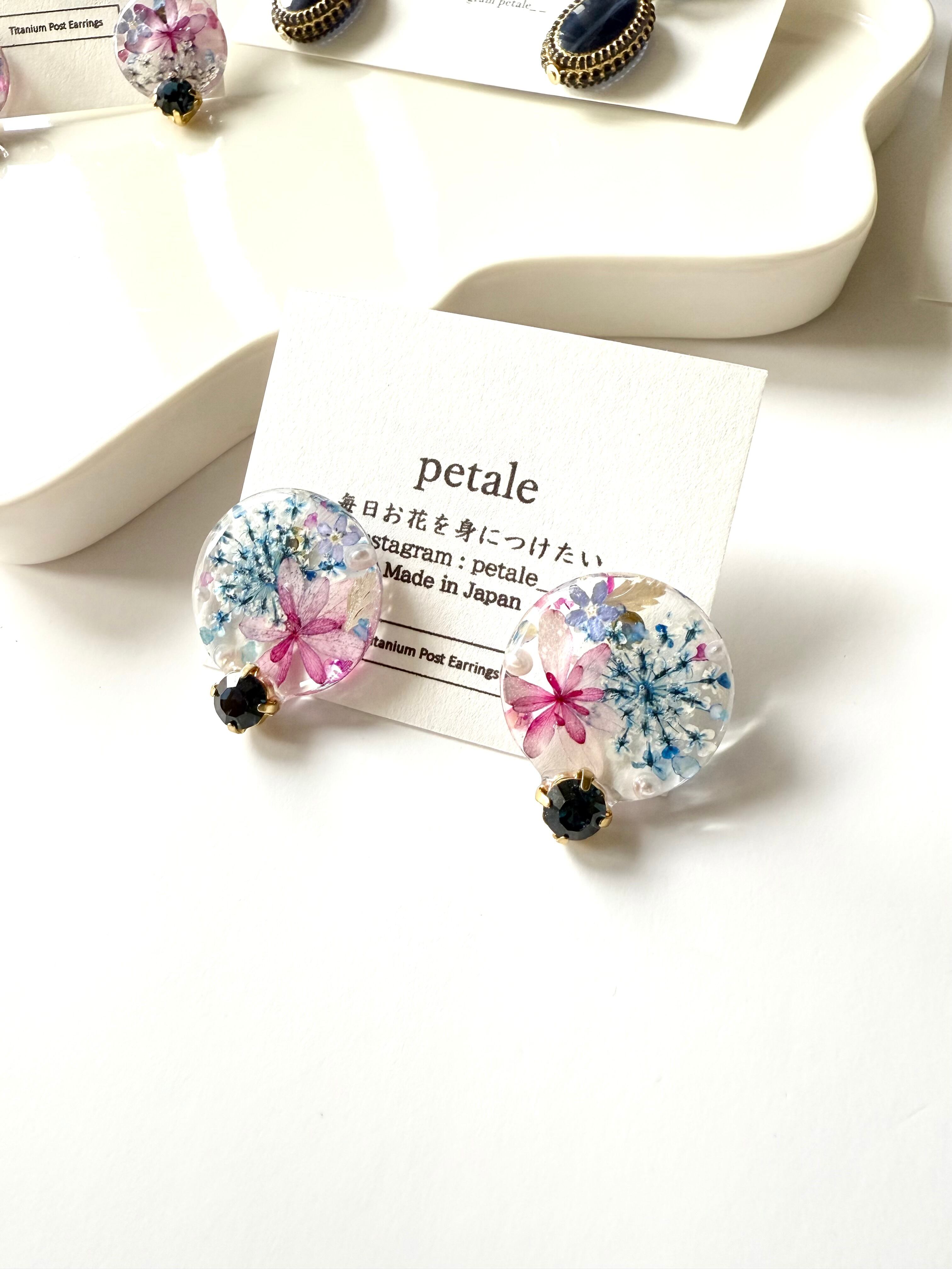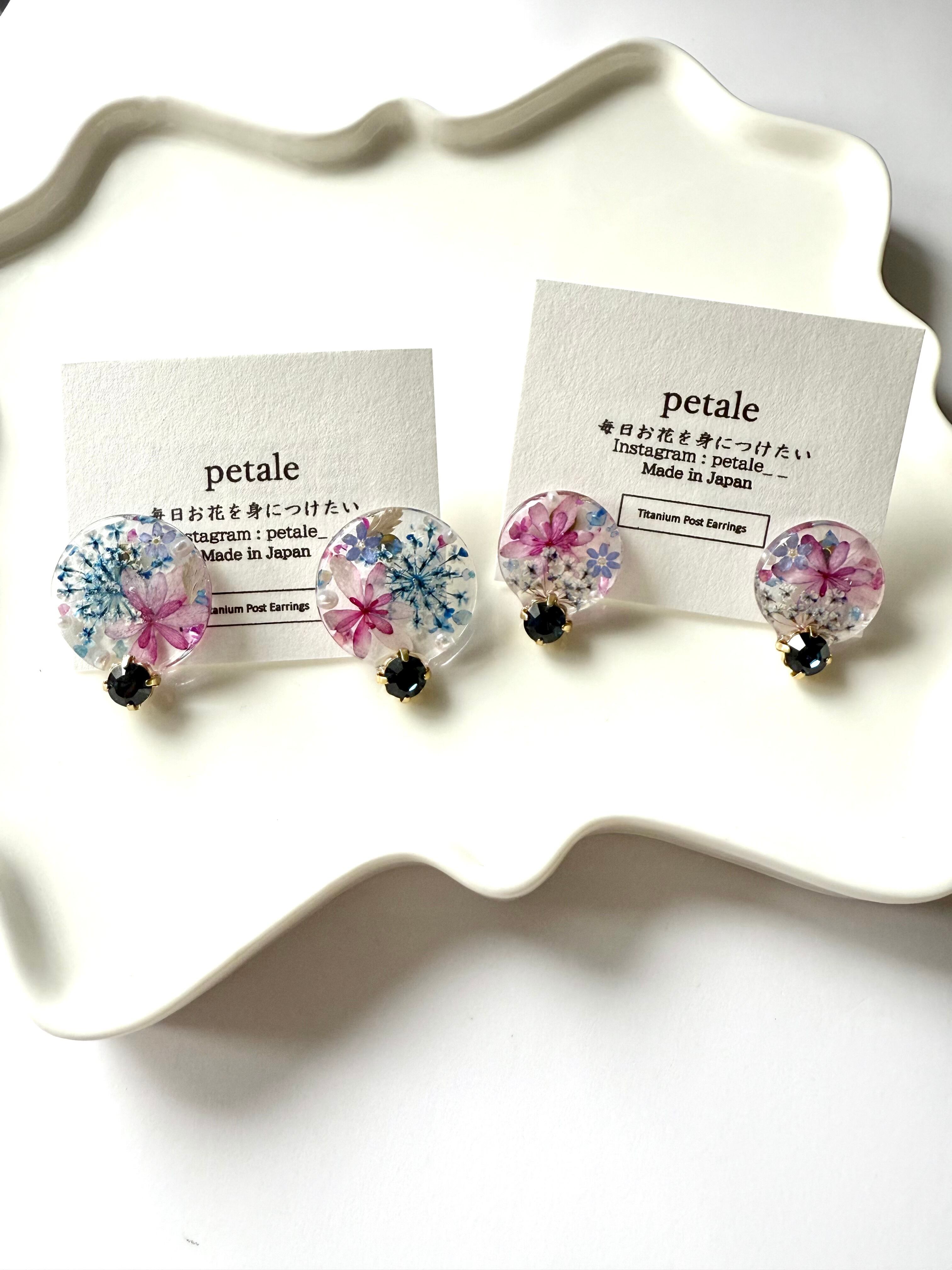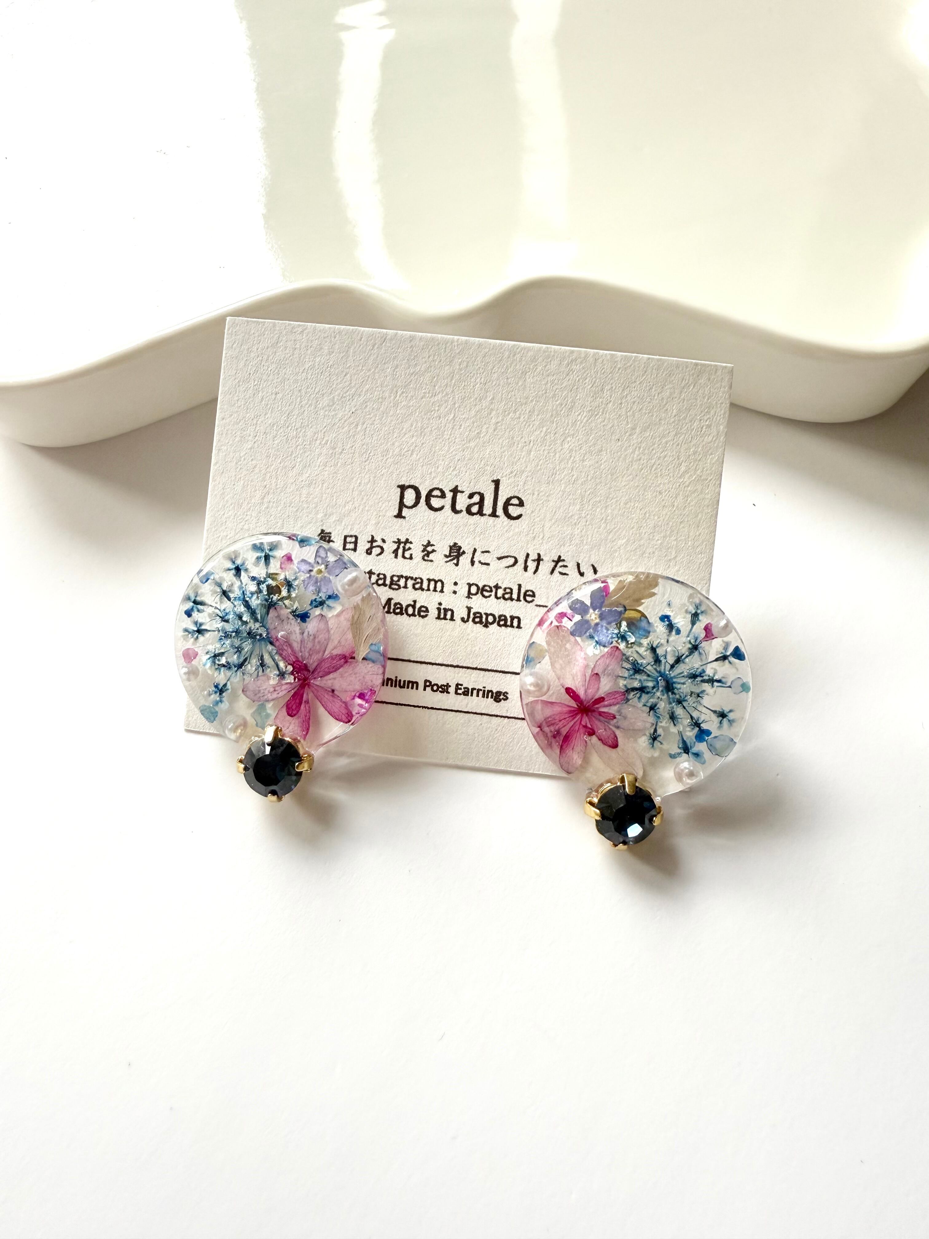 50%off ピンク紫陽花とブルーの花咲くラウンドビジューピアス