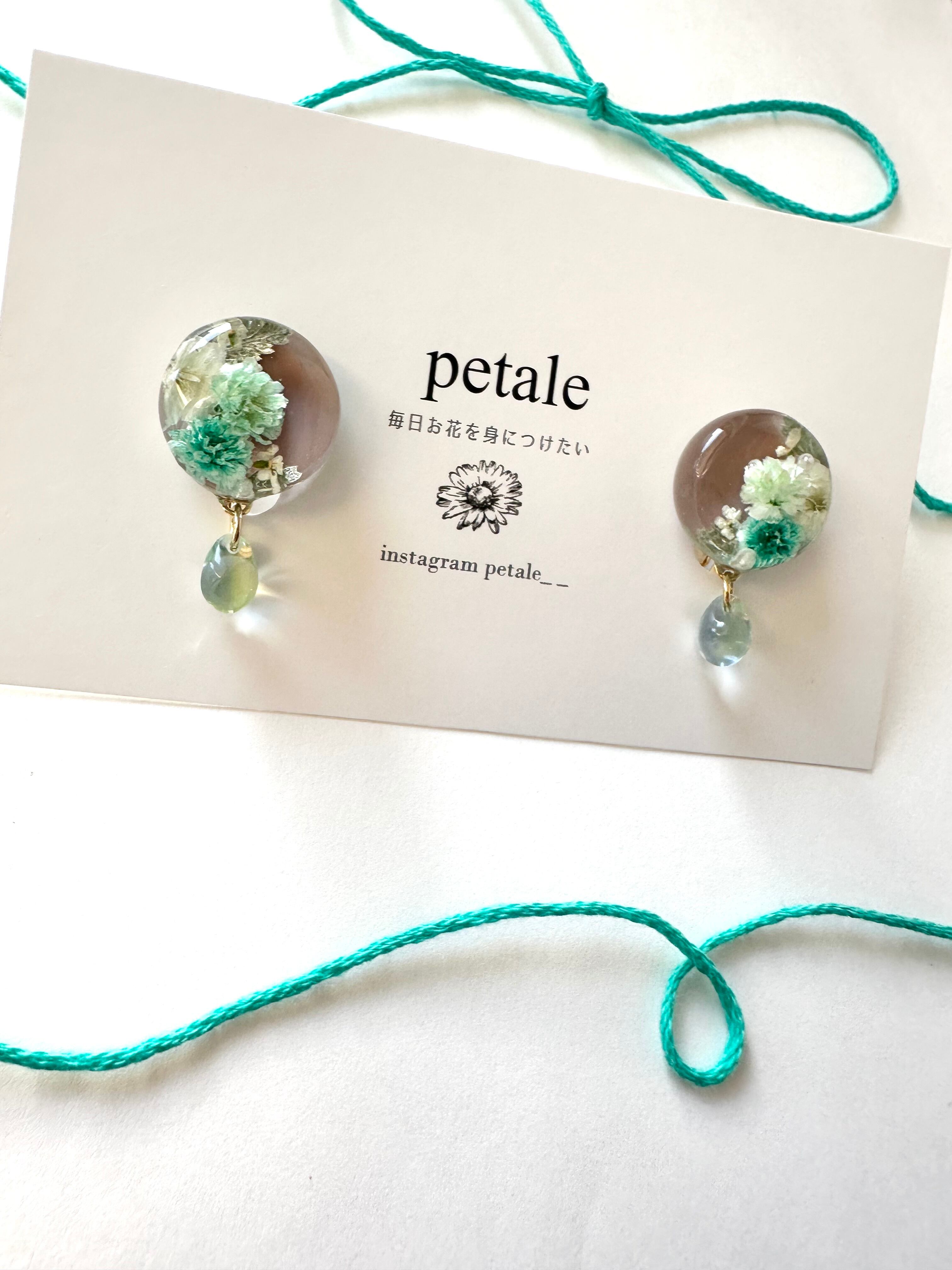 ミントカラーの花咲くミニラウンド+しずくガラスビーズチャームイヤーアクセサリー