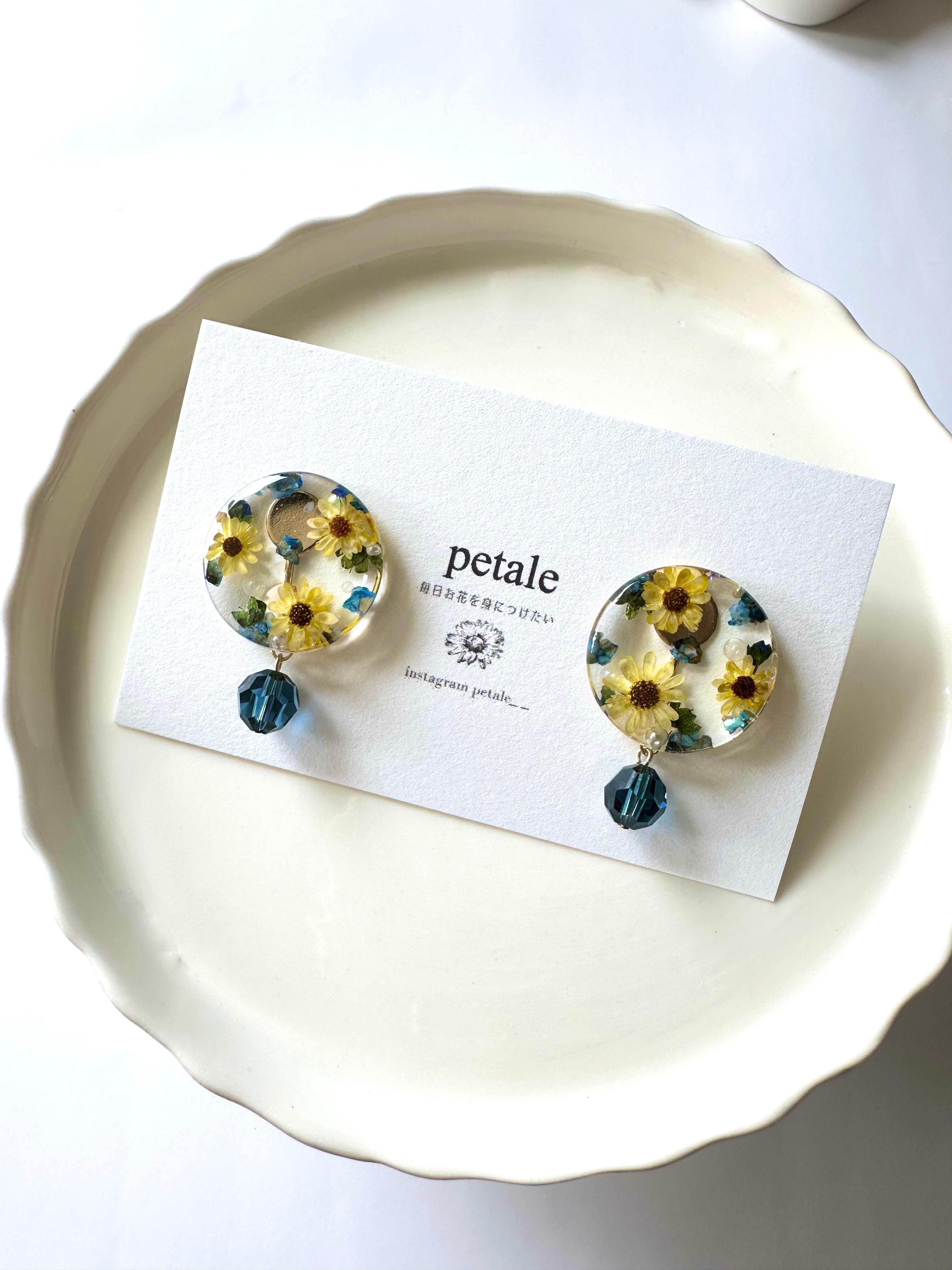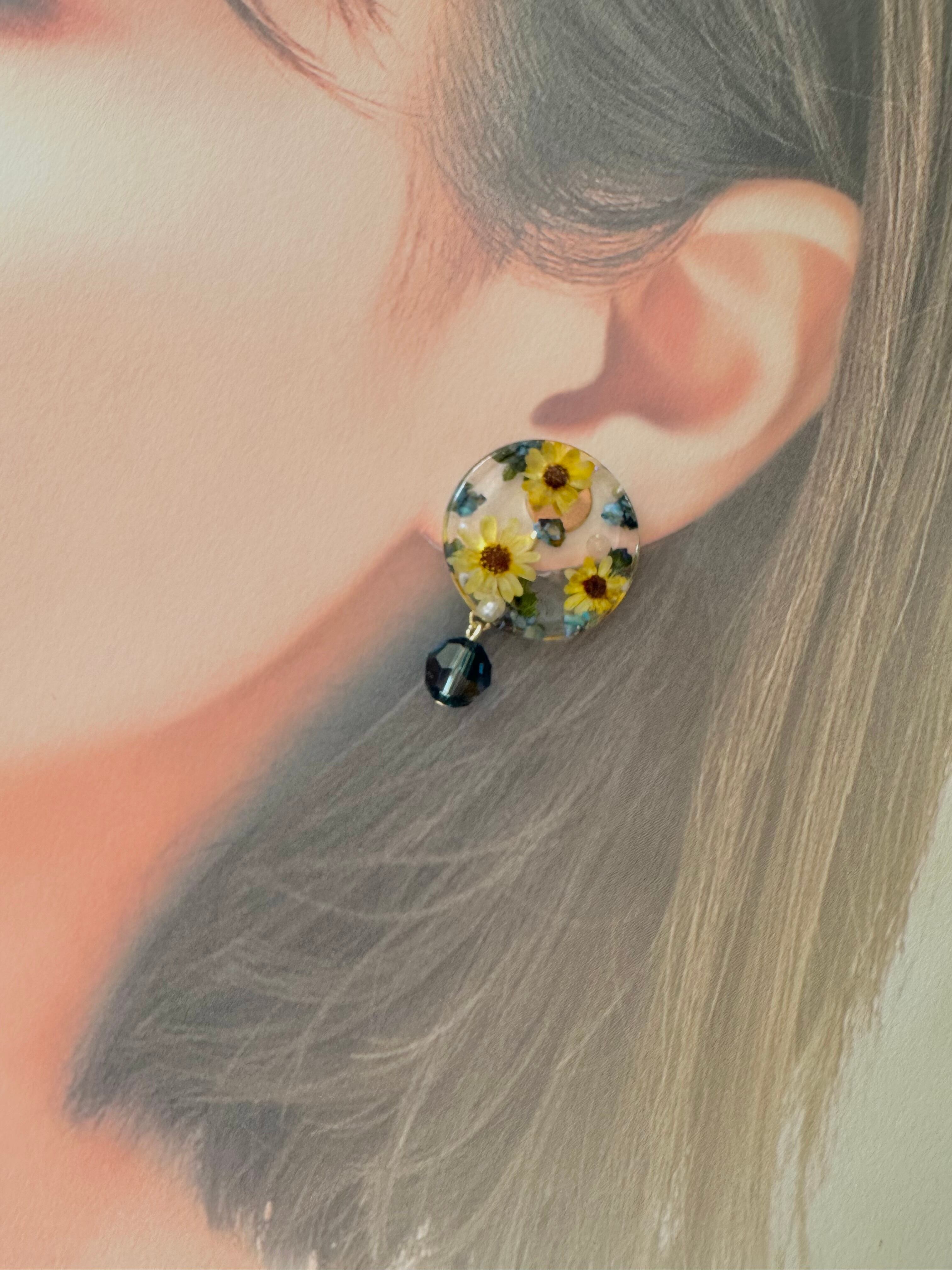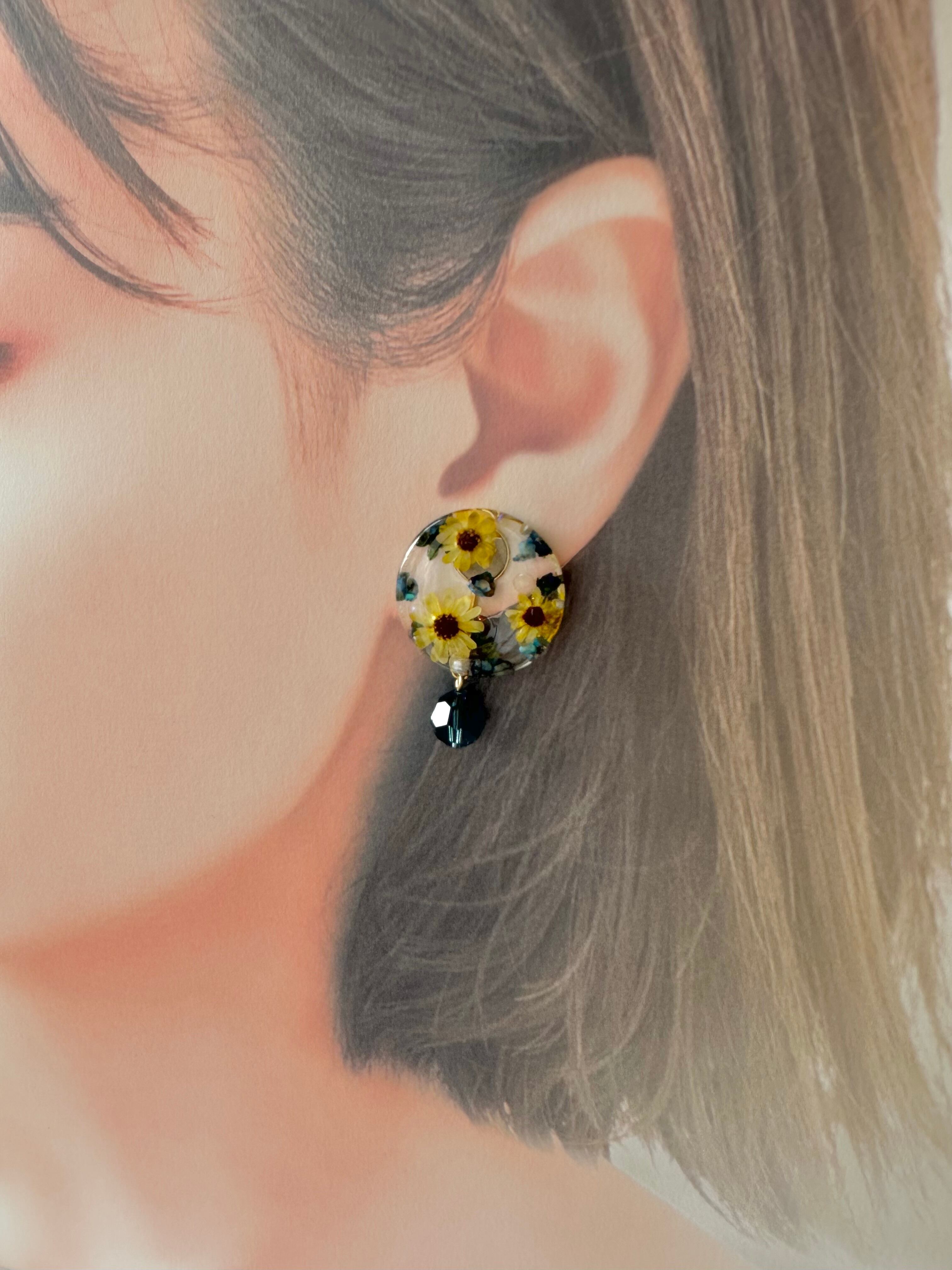 ひまわりの花柄ラウンド+クリスタルビーズイヤーアクセサリー